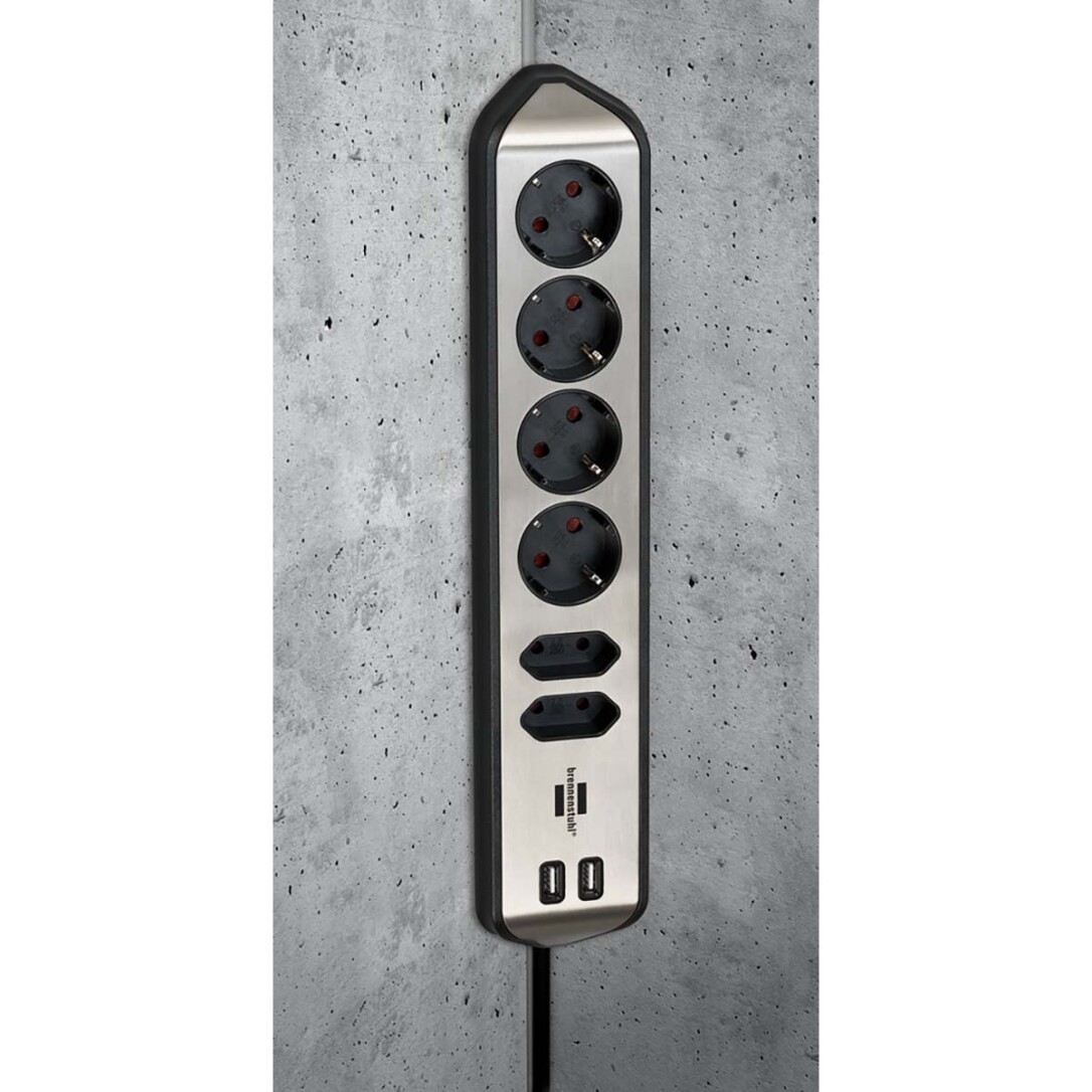 The compact brennenstuhl®estilo corner extension lead made of highly break-resistant plastic and high-quality stainless steel surface brings order to your home. The universally applicable power strip can be easily attached as a kitchen power strip for your countertop or as a table power strip for your workplace using special adhesive pads. The kitchen or table power strip can be mounted horizontally or vertically. The power strip has 4 earthed contact sockets and 2 Euro sockets, so you can use several devices at the same time. It also convinces with the following features: