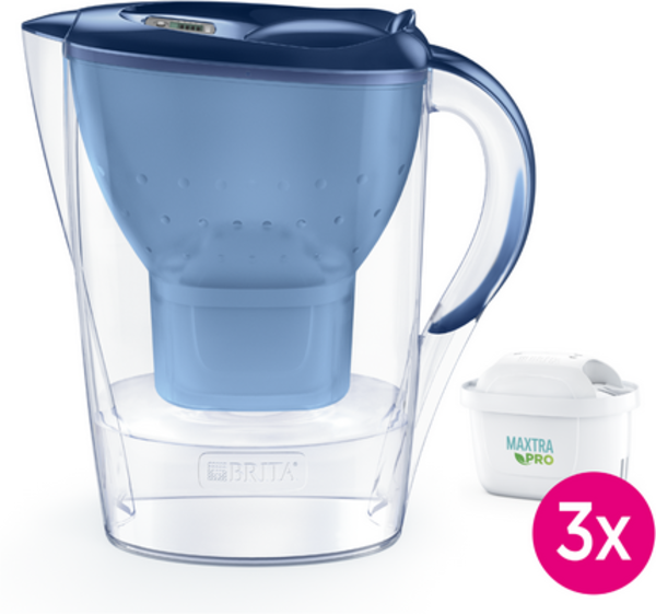 Brita Marella. Wasserfiltertyp: Manueller Wasserfilter, Produktfarbe: Blau, Fassungsvermögen Wassertank: 2,4 l. Breite: 258 mm, Tiefe: 105 mm, Höhe: 258 mm. Anzahl der Patronen: 3 Stück(e), Verpackungsinhalt: MAXTRA+ filter cartridge x 3