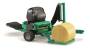 The bale is lifted onto the rotating table via the front loading rocker. After the loading rocker is lowered the automatically rotating revolving table is set in motion, thus simulating the wrapping process. During the wrapping process the loaded round bale is rotated around its vertical axis and via roller drive around its axial axis at the same time with the aid of the rotating construction. The bale is then dumped onto the mobile depository rocker by the dumping mechanism. One ochre-brown and one black round bale are included. The drawbar position can be adjusted according to the application and tread tyres round off the image.