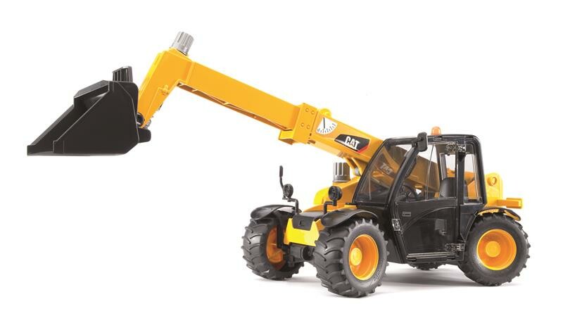Der CATERPILLAR Teleskoplader ist ein wahres Multitalent. Ob es um das Schaufeln von großen Erdmassen, oder um das Verladen von empfindlichen Gütern auf Paletten geht, jederzeit ist der CAT Teleskoplader ein zu- verlässiger und effektiver Partner. Gerade seine geringen Abmessungen in Kombination mit dem weit ausfahr-baren Teleskoparm machen ihn oft zur ersten Wahl in den unterschiedlichsten Einsatzgebieten. Über vier sil- bern hervorgehobene Drehgriffe funktioniert die präzise Steuerung des CAT-Modells. Neben den Funktionen wie Verstellen der Armhöhe, Ausfahren des Arms und Winkelverstellung der Werkzeugaufnahme verfügt der Teleskoplader über eine gut arbeitende Vierradlenkung. Diese Lenkung des CAT Teleskopladers macht das Handling des Fahrzeuges, sowohl beim Original, als auch bei dem Modell von BRUDER, zu einem Kinderspiel.
