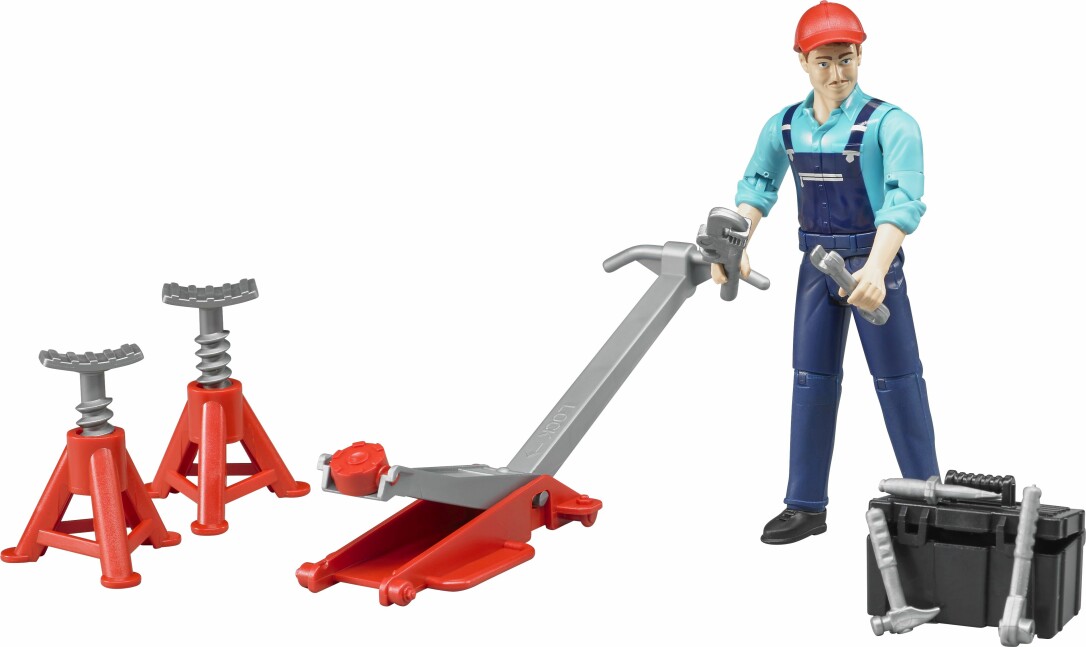 Mechaniker in Latzhose und Kappe mit Wagenheber, Unterstellböcke und Werkzeugkiste samt Werkzeug