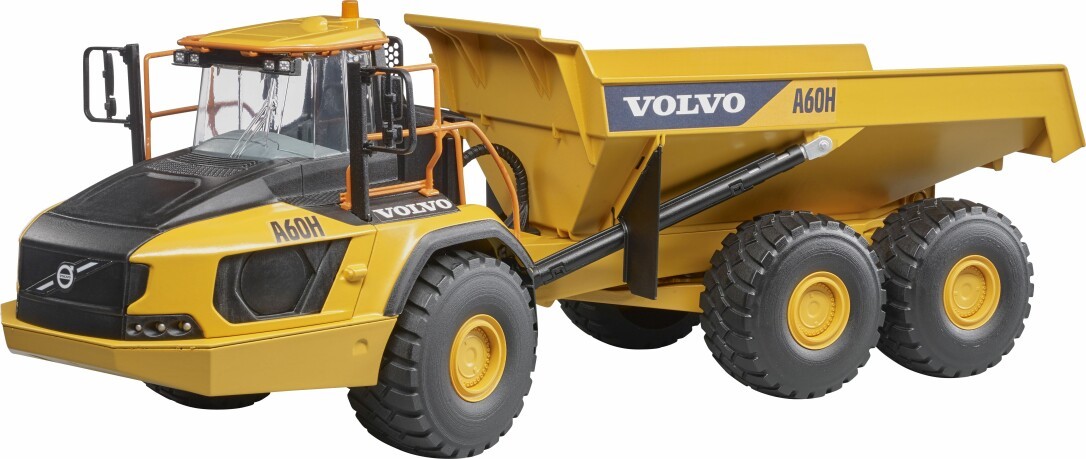 Haulers are true workhorses! Be it to efficiently transport bulk goods as part of earthmoving, asphalt as part of road construction, overburden in quarries and gravel pits, this tipper can rely on its strengths. As one of the most powerful articulated hauler the Volvo A60H has now been added to the BRUDER themed world of construction equipment. Just like the real thing, the model guarantees exemplary off-road capabilities thanks to its solid articulated steering in conjunction with massive balloon tyres. One bworld figure can take to the wheel of the vehicle through the roof hatch of the extremely modern cab and young hauler drivers can load and unload the genuine, enormous tipping trough.