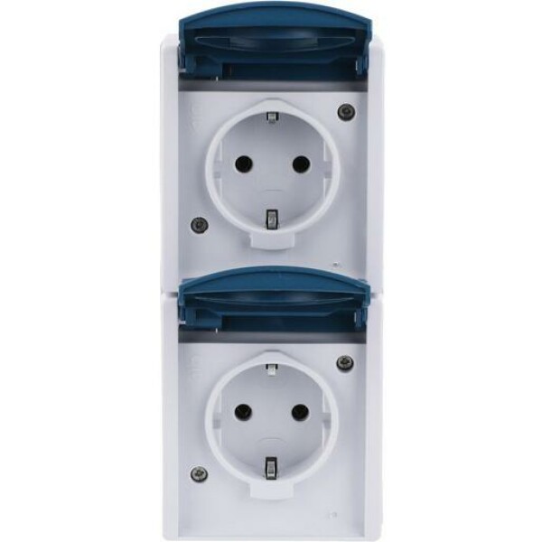 Busch-Jaeger 2084-0-0701. Socket type: CEE 7/3, Number of poles: 2P+E. Product colour: Blue, White, International Protection (IP) code: IP44. Rated voltage: 250 V, Rated current: 16 A. Width: 71 mm, Depth: 55 mm, Height: 167 mm