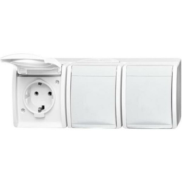 Busch-Jaeger 2084-0-0712. Socket type: CEE 7/3, Number of poles: 2P+E. Product colour: White, International Protection (IP) code: IP44. Rated voltage: 250 V, Rated current: 16 A. Width: 222 mm, Depth: 55 mm, Height: 83 mm