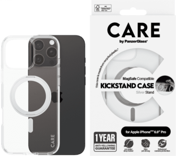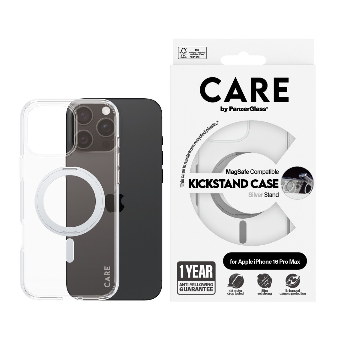 PanzerGlass CARE by ® Feature Case Transparent m. Silber Kickstand & MagSafe iPhone 16 Pro Max. Etui-Typ: Cover, Markenkompatibilität: Apple, Kompatibilität: Apple - iPhone 16 Pro Max, Produktfarbe: Transparent