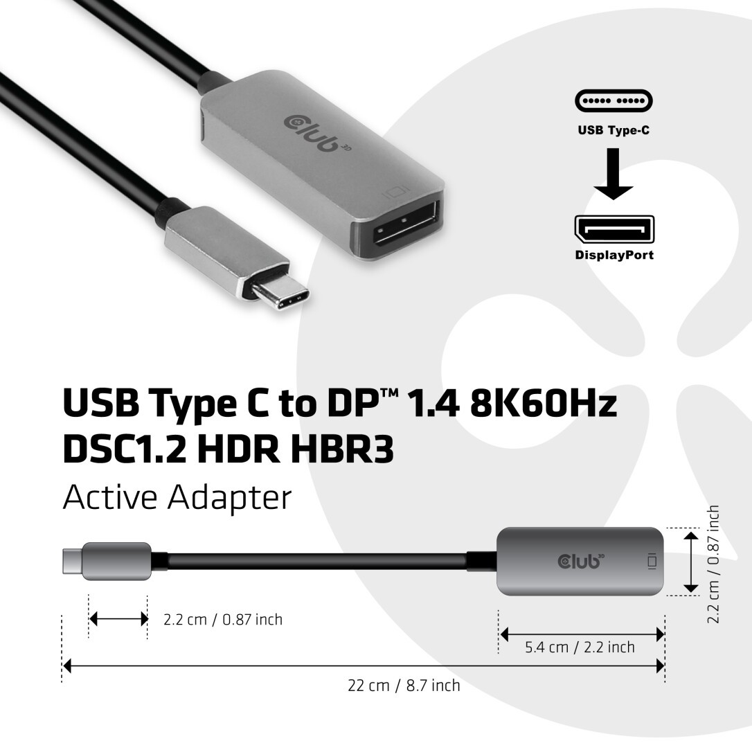 CAC-1567 - The Club 3D USB Type C to DisplayPort™ 1.4 Adapter 8K60Hz provided the source supports DSC1.2 HBR3 allows you to connect any USB Type C source to DisplayPort™ display at max 8K60Hz resolution and HDR support.