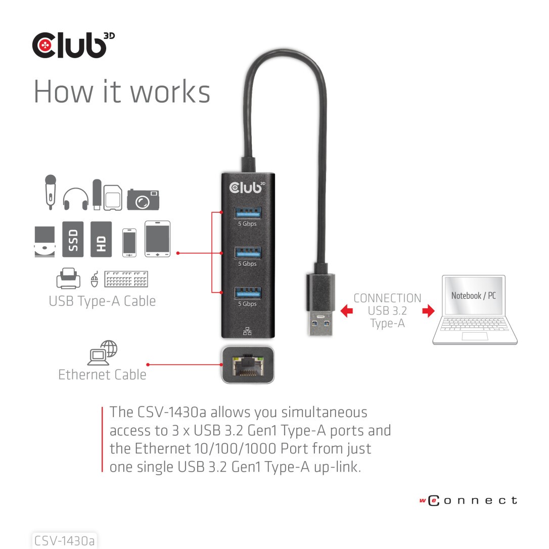 CLUB3D CSV-1430a, Kabelgebunden, USB 3.2 Gen 1 (3.1 Gen 1) Type-A, 1000 Mbit/s, Schwarz, USB, USB Typ-C