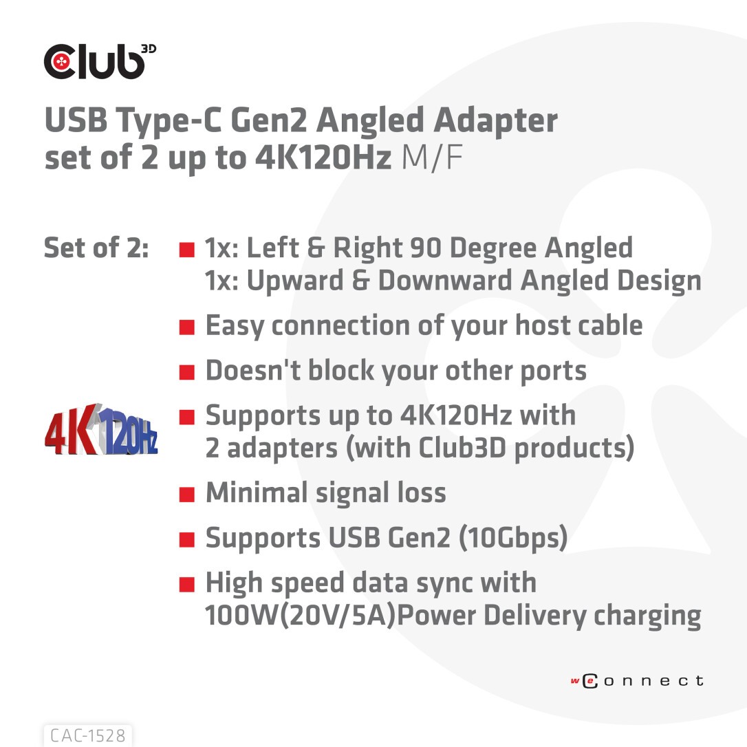 CLUB3D USB Type-C Gen2 Angled Adapter set of 2 up to 4K120Hz M/F. Anschluss 1: USB C, Anschluss 2: USB C. Produktfarbe: Schwarz