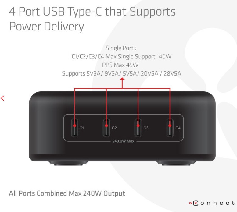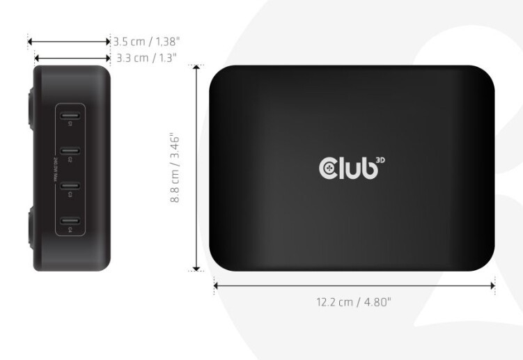 CLUB3D CAC-1918. Energiequelle: AC, Aufladekompatibilität: Universal. Eingangsspannung: 100-240 V. USB Typ-C Anzahl Anschlüsse: 4, Energieschutzeigenschaften: Überstrom, Überspannung, Überhitzung, Überlastschutz, Kurzschluß. Produktfarbe: Schwarz