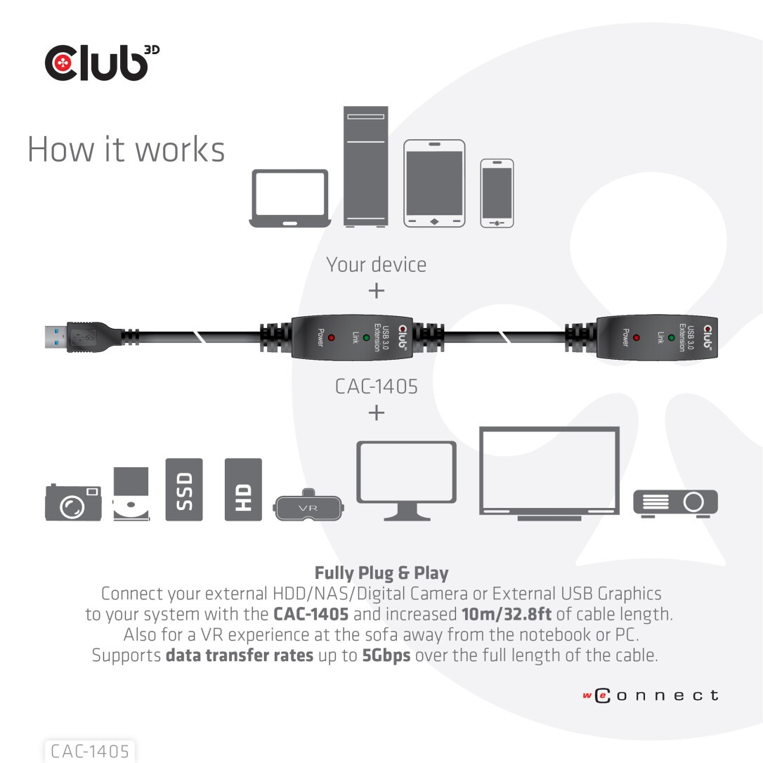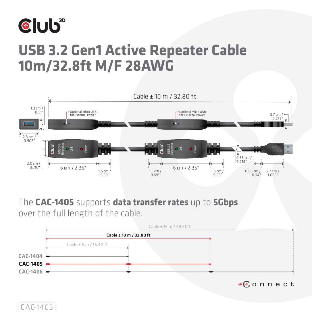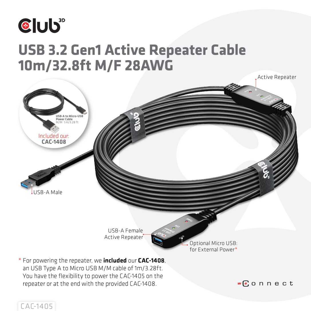CLUB3D CAC-1405, 10 m, USB A, USB A, USB 3.2 Gen 2 (3.1 Gen 2), Schwarz