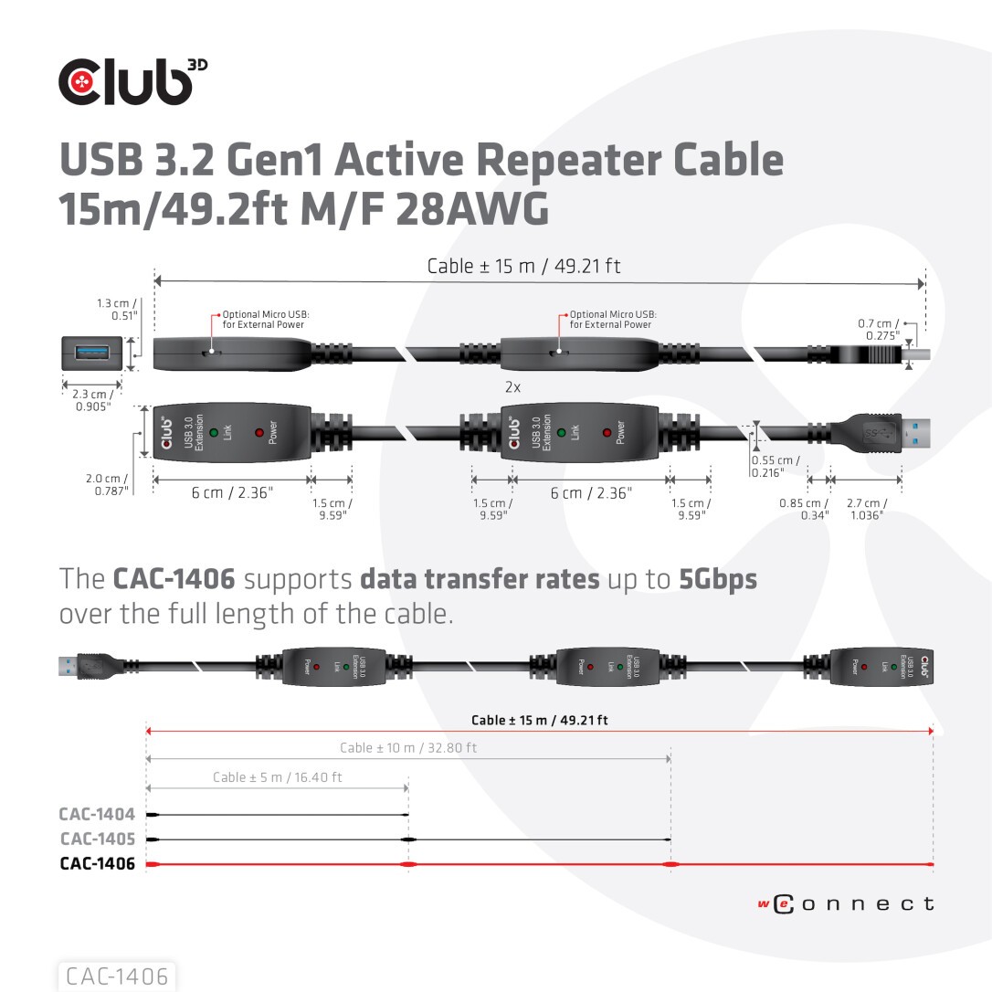 With this Club3D USB 3.2 Gen1 Active Repeater Cable CAC-1406, you can go far beyond the standard USB Cable length limitation of 3 meters /9.84 feet, without loss of Data Transfer Speed. The USB 3.2 Gen1 Active Repeater Cables are fully Plug & Play and do not require any driver installation. Just connect your external USB device like External HDD/NAS/Digital Camera or External USB Graphics to your system with the CAC-1406 and have flexibility of the increased 15 meters / 49.2 feet of extra cable length. Also for a VR experience at the sofa away from the notebook or PC this cable provides you with the freedom of movement.
