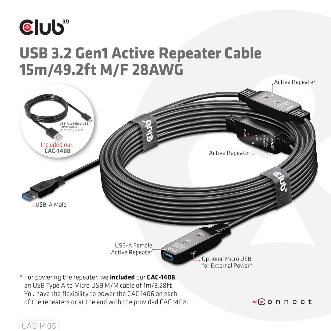For powering the repeater, we included our CAC-1408, an USB Type A to Micro USB M/M cable of 1m/3.28ft. You have the flexibility to power the CAC-1406 on each of the repeaters or at the end with the provided CAC-1408.