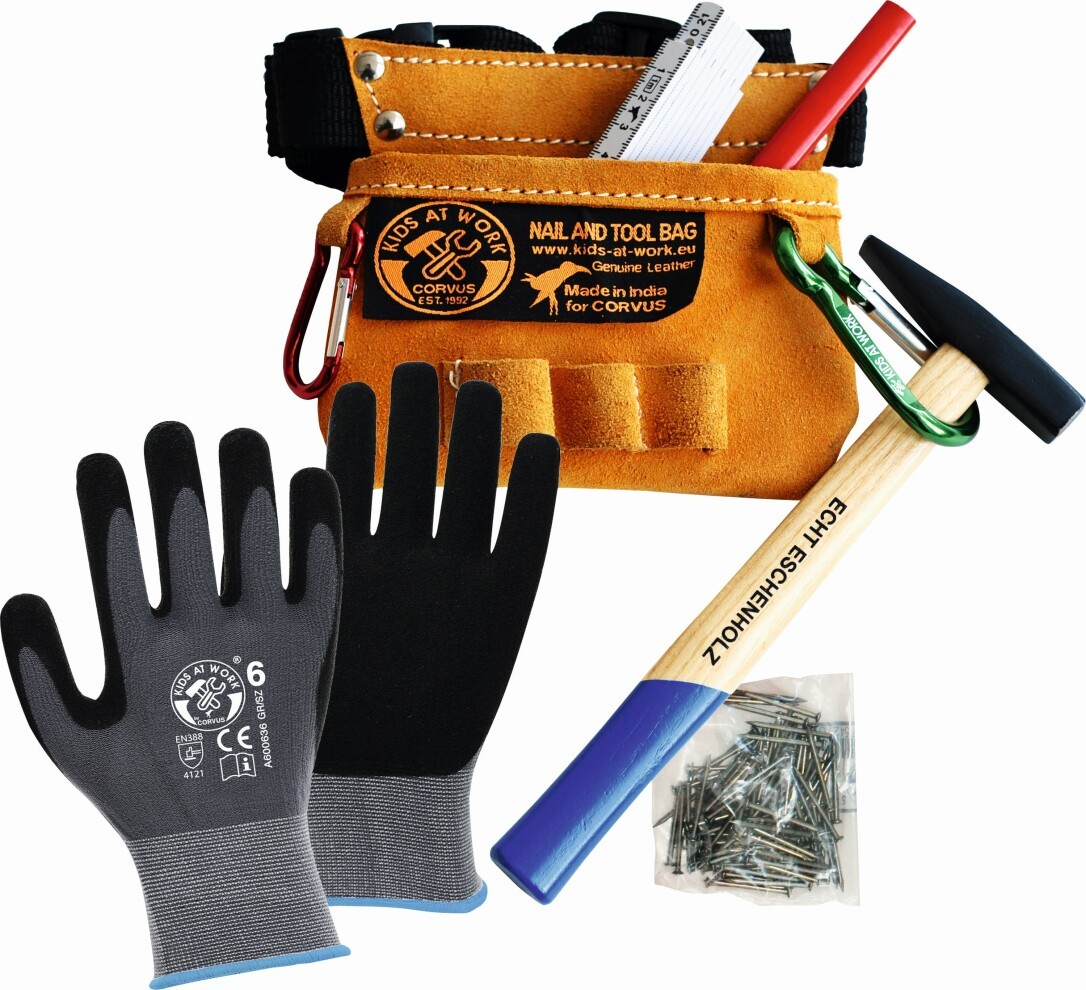CORVUS Kids at Work Werkzeuggürtel mit Inhalt - Meterstab, Holzhammer, Nägel,