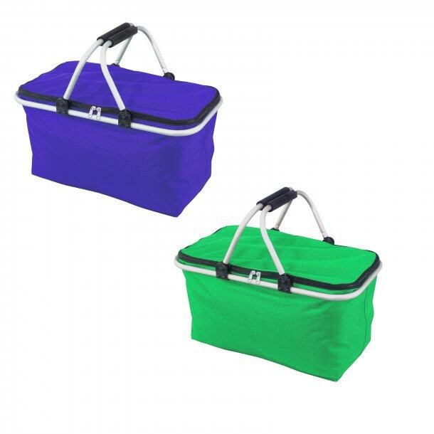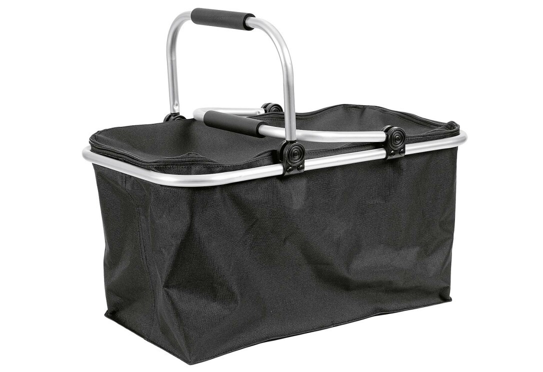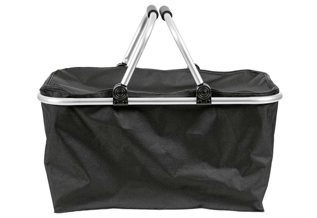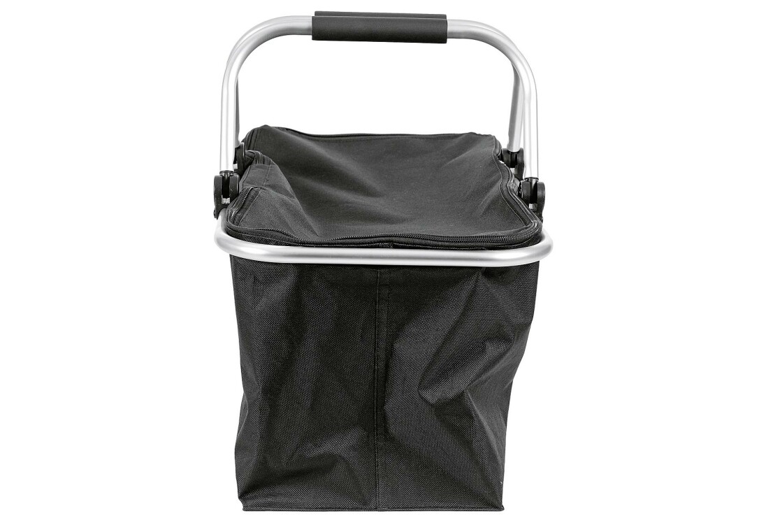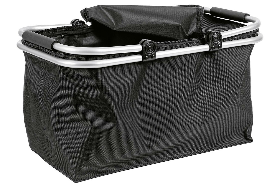 Faltbarer Korb mit Abdeckung und umlaufendem Reißverschluss – ideal zu m Einkaufen bei jeder Wetterlage, platzsparend zu verstauen, leicht zu transportieren. 2 klappbare Henkel mit weichen Softgriffen für maximalen Tragekomfort – kein Abrutschen, kein Einschneiden. Leichter Aluminiumrahmen mit Polyestertasche, farbig sortiert: blau, grün. Maße: ca. 48 x 26 x 28 cm, Klappmaße: ca. 48 x 5,5 x 28 cm, Fassungsvermögen: ca. 23 l, max. Tragkraft: 15 kg, Gewicht: ca. 418 g.