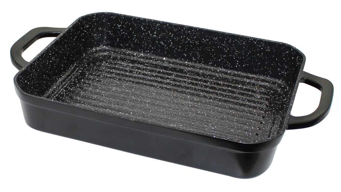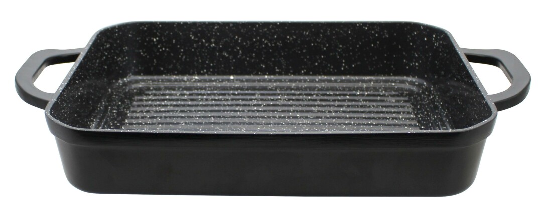 ELO Aluguss Rechteckbräter „Belugo“ mit Grillboden. Als besonderes Feature verfügt der Belugo Bräter über einen Grillboden. Fleisch oder mariniertes Gemüse liegen nur auf dem Grillprofil des Bräters auf. An diesen Stellen konzentriert sich die Hitze und bildet das typische Streifenmuster auf dem Bratgut. Dank der hochwertigen ELODUR® Select Antihaftversiegelung ist der Bräter äußerst kratzfest. Durch die eingearbeiteten Griffe liegt der Bräter sehr gut in der Hand. Der gelochte Induktionsboden ist für alle Herdarten geeignet und sorgt für eine gleichmäßige Wärmeverteilung vom Boden bis zum Rand. Maße: 3,4 l, (LxBxH): 41,5x26x6,5 cm. Gewicht: 1,325 kg. Eigenschaften: mit Grillboden | ELODUR® Select Antihaftversiegelung | gelochter Induktionsboden sorgt für eine gleichmäßige Wärmeverteilung.
