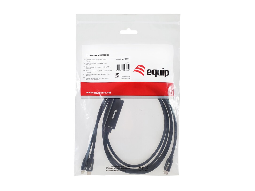 Equip USB-C-auf-C-Y-Ladekabel, 1.5m, PD 140 W, Schwarz. Kabellänge: 1,5 m. Anschluss 1: USB C, Anschluss 2: 2 x USB C, USB-Version: USB 2.0, Max. Datenübertragungsrate: 0,48 Gbit/s, Produktfarbe: Schwarz