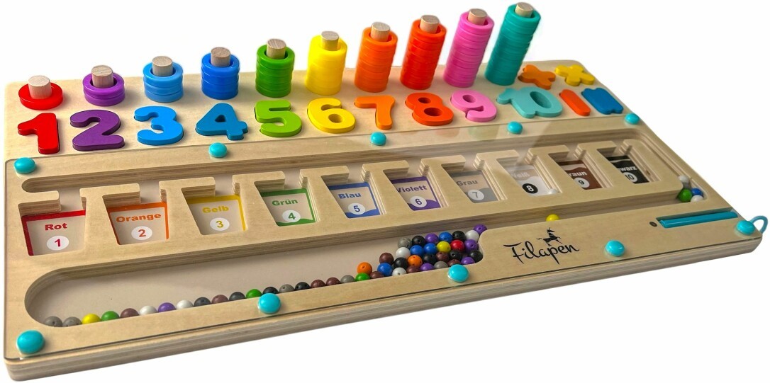 Filapen Montessori Motorikspielzeug - Magnetspiel aus Holz Das einzigartige Motorikbrett von Filapen® dient nicht nur als faszinierendes Labyrinth- Spiel, sondern fördert auch spielerisch die Feinmotorik Ihrer Kinder. Dieses Holzspielzeug ist perfekt dafür geeignet, die Hand-Augen-Koordination zu verbessern, die Farberkennung zu schulen und die motorischen Fähigkeiten auf unterhaltsame Weise zu stärken. FARBEN LERNEN: Ausgestattet mit bunten Kugeln in verschiedenen Farben, bietet es eine spannende Herausforderung: Mit einem speziellen Magnetstift gilt es, jede Kugel in das farblich passende Fach zu ziehen. ZAHLENVERSTÄNDNIS: Die Kinder können spielerisch, Holzzahlen von 1 bis 10 in die entsprechenden, eingestanzten Stellen setzen. Dieses pädagogisch wertvolle Spielzeug verbessert somit nicht nur die Hand-Augen-Koordination.