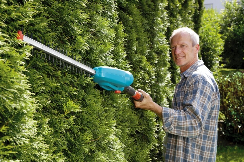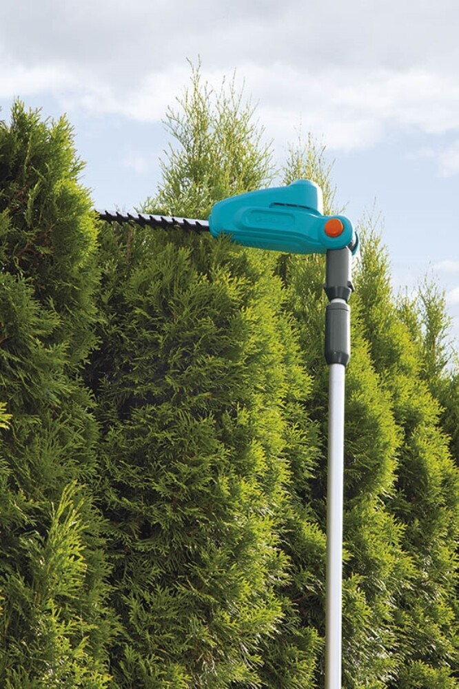 High hedges protect privacy. But when they need to be trimmed, you’ll soon wish privacy weren’t such a priority, since that would make things a lot easier. Unless you use the GARDENA Battery Telescopic Hedge Trimmer THS 42/18V P4A. It can easily handle even three-metre-high hedges. Cutting on shaky ladders is a thing of the past, you can always stand safely on solid ground with both legs and you’ll never have to worry about power cables. Thanks to a LED indicator directly on the handle, you are always aware of the current charge level. This tool is compatible with all batteries from the 18V FOR ALL ALLIANCE. Depending on the battery used, the product can reach a battery run time of up to 240 minutes and cut up to 600 square metres of hedge. The telescopic trimmer weighs 3.0 kilograms without battery; its handle is ergonomically designed and it has an ideal centre of gravity. This means that it fits comfortably and securely in your hand even when the telescopic handle is fully extended, allowing you to use the full three-metre range. Do you need to trim the hedgetop? Not a problem: the head of the trimmer can be tilted – a function that is also very convenient when cutting ground cover. You no longer have to bend down and it's easy on your knees. Branches and twigs of up to 16 millimetres in thickness will fall without much effort; the optimised blade geometry ensures that every cut is made efficiently and cleanly. Thanks to the 42-centimetre blade length, you'll quickly get your hedges into shape across their entire width. If you want to transport or store your telescopic hedge trimmer, you can separate it into two parts, easily and without tools. The GARDENA Battery Telescopic Hedge Trimmer THS 42/18V P4A solo is supplied without battery and charger. You can use any 18V battery from the POWER FOR ALL ALLIANCE. These batteries can be used for numerous devices around the house and garden. So you save money and remain flexible! Would you prefer to buy the product with the battery and charger included? Not a problem – then the Ready-To-Use Set is the right one for you. Passion powered by GARDENA – Battery garden equipment that gives you the freedom to create.
