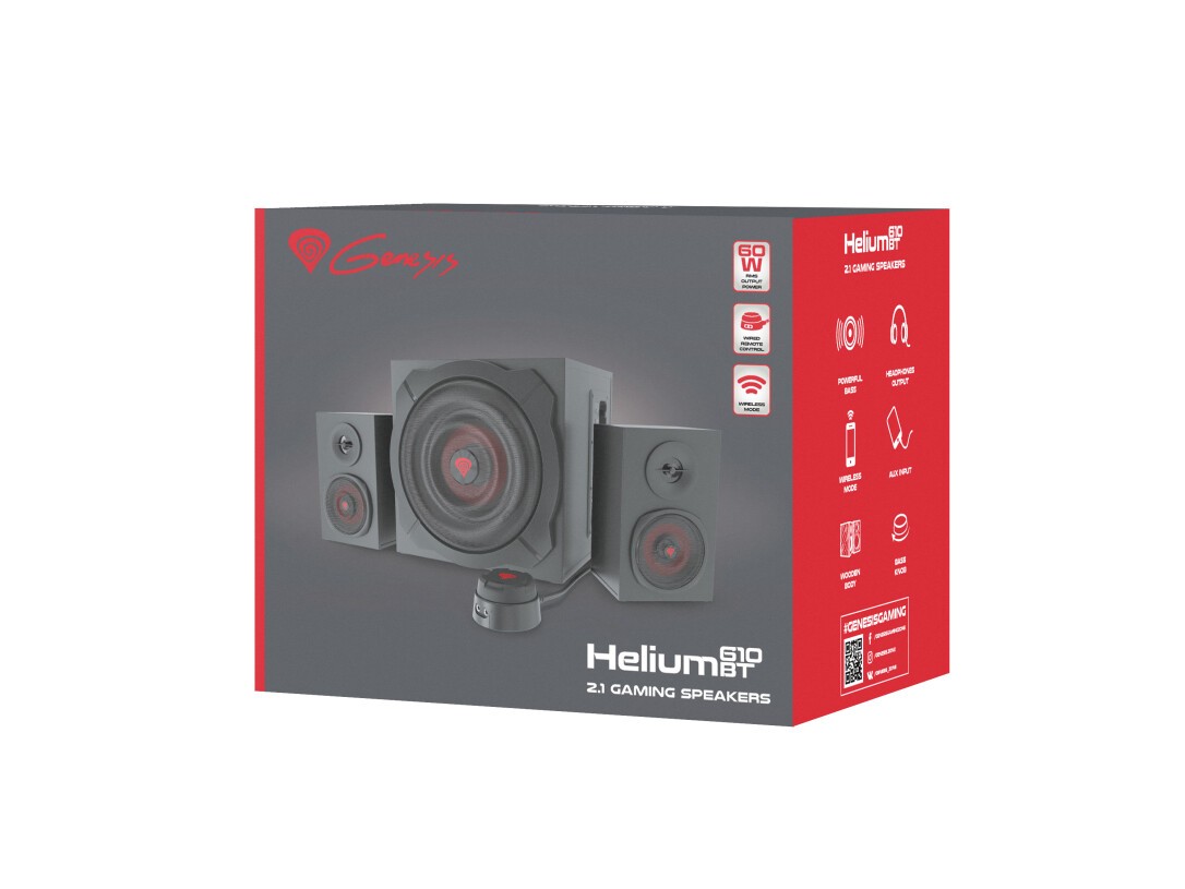 GENESIS Helium 610BT. Audio Kanäle: 2.1 Kanäle, RMS-Leistung: 60 W, Empfohlene Nutzung: PC/Laptop. Satellite Lautsprecher type: 2-Wege, Satelliten Effektivwert Energie: 30 W, Satellitenlautsprecherfrequenzbereich: 40 - 20000 Hz. Subwoofer-Typ: Aktiver Subwoofer, Subwoofer Effektivwert Energie: 30 W, Subwoofer Abmessungen (WxDxH): 250 x 260 x 255 mm. Energiequelle: AC, AC Eingangsspannung: 230 V. Übertragungstechnik: Verkabelt & Kabellos, Kopfhörer-Anschluss: 3,5 mm