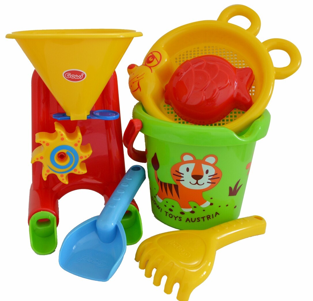 Der Sand- und Wasserspaß kann beginnen! Das Sand Set Tiger darf in keiner Sandkiste oder am Sandstrand fehlen! Geeignet für Kinder ab 12 Monaten ist Spiel und Spaß in der Sandkiste oder am Strand garantiert. Das Set besteht aus aus einem Eimer, einer Sand- und Wassermühle, einer Schaufel, einem Rechen, einer Fisch-Sandform und einem Sieb. Die verschiedenfarbigen Teile sind für Kinderhände optimal gestaltet und sind sehr robust und stabil. Mit diesem Set können Sandburgen gebaut werden und Sand gesiebt oder geschaufelt werden. Das Sandförmchen zaubert süße Fische in den Sand. Das Highlight dieses Sets ist aber die Sand-und Wassermühle. An ihrer Spitze kann feiner Sand oder Wasser eingefüllt werden, welches durch den eingebauten Schieberegler freigegeben werden kann, um anschließend durch ein Sonnenrad zu fließen. Durch die Standfüße fällt die Mühle nicht so schnell um und durch die rote Wand kann die Mühle auch bei anderen Gegenständen angelehnt werden. Das Fassungsvermögen des Eimers beträgt 2 l. Hergestellt wird das Sand Set Tiger aus hochwertigen Kunststoff in Europa und kann nach dem Spielen leicht mit Wasser gereinigt werden. Inhalt: 1 Stück (6tlg) Material: Kunststoff Farbe: bunt Maße (L x B x H): - Eimer: 18,5 cm Druchmesser x 16 cm Höhe - Sand- u. Wassermühle: 25,5 x 15 x 13,5 cm - Sieb: 23,5 x 18 x 4,5 cm - Rechen: 19 x 9 x 4 cm - Schaufel: 22 x 8 x 4 cm - Sandform: 13 x 12 x 5 cm Gewicht: 484 g Verpackung: Netz