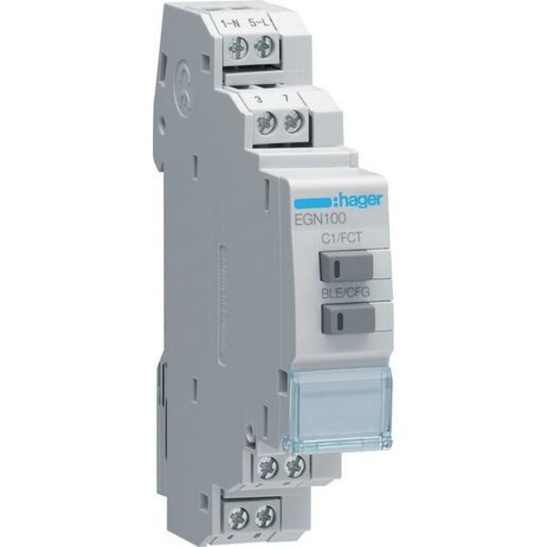 Hager EGN100. Type: Time switch, Compatible load types: Single-phase AC motor, Connectivity technology: Wired. AC input voltage: 230 V, AC voltage range: 230 - 254 V, AC input frequency: 50 - 60 Hz. Width: 17.8 mm, Depth: 62.5 mm