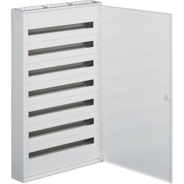 Aufputz-Feldverteiler Schutzklasse I für Geräte bis 125A, Farbe: reinweiß (RAL9010), Normen: EN 61439-3 kompletter Verteiler mit durchgängigen Gerätschlitzen und Stahlblechberührungsschutzabdeckungen, Hutschienenabstand 150 mm, Lieferform ohne PE/N Klemmen, Verdrahtungsraum Zu- und Abgang.