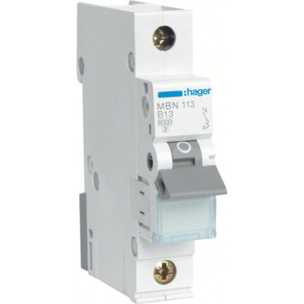 Hager MBN113. Rated current: 13 A. Type: Type B, Modules quantity (max): 1 module(s). Width: 17.5 mm, Depth: 70 mm, Height: 83.4 mm