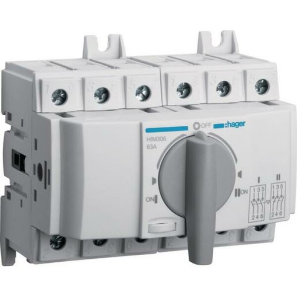 Modularer 3poliger Umschalter nach EN 60947, zum umschalten unter Last von 2 Niederspannungsstromkreisen. Mit Sicherheitstrennung und 3 Schaltstellungen I-0-II. Für die Montage auf Hutschiene oder Montageplatte geeignet.