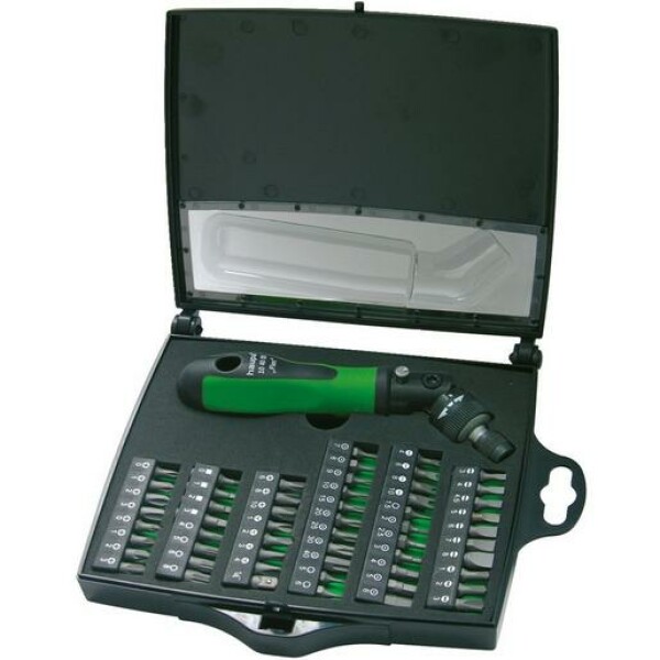 Knarrenschraubendreher mit Rechts-/Linkslauf. Verstellbarer Arbeitswinkel von 180°. Sicherheits- und Spezialbitsatz - Spitzenqualität S2! Der Schraubgriff mit Schnellauswurf und 2-Komponenten-Handgriff sorgt für rutschsicheres und ermüdungsfreies Arbeiten. Die ergonomische Form und die Soft-Zonen im Druckflächenbereich ermöglichen ein entspanntes Schrauben. Mit Aufhängeloch.