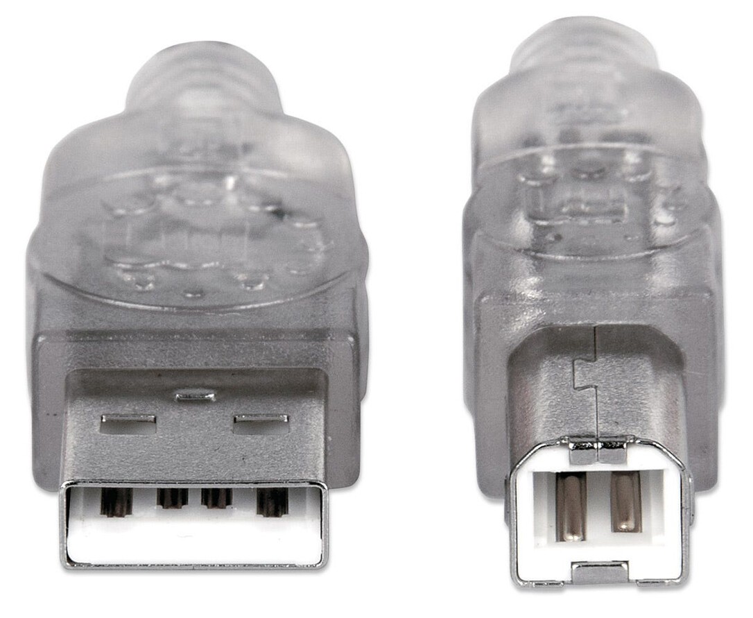Manhattan USB-A to USB-B Cable, 3m, Male to Male, Translucent Silver, 480 Mbps (USB 2.0), Equivalent to Startech USB2AA2M (except colour), Hi-Speed USB, Lifetime Warranty, Polybag. Cable length: 3 m, Connector 1: USB A, Connector 2: USB B, USB version: USB 2.0, Connector gender: Male/Male, Maximum data transfer rate: 480 Mbit/s, Connector contacts plating: Gold, Product colour: Silver, Magnetically shielded