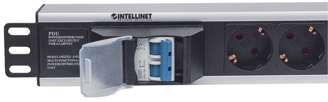 Intellinet 19" 1.5U Rackmount 6-Way Power Strip - German Type" - With Double Air Switch - No Surge Protection - 1.6m Power Cord (Euro 2-pin plug) - 1.5U - Vertical - Aluminium - Black - Grey - 6 AC outlet(s) - Type F