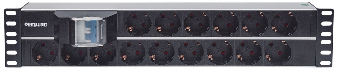 Intellinet 19" 2U Rackmount 15-Way Power Strip - German Type" - With Double Air Switch - 3m Power Cord (Euro 2-pin plug) - Basic - Switched - 2U - Horizontal - Aluminium - Aluminium - Black - 15 AC outlet(s)