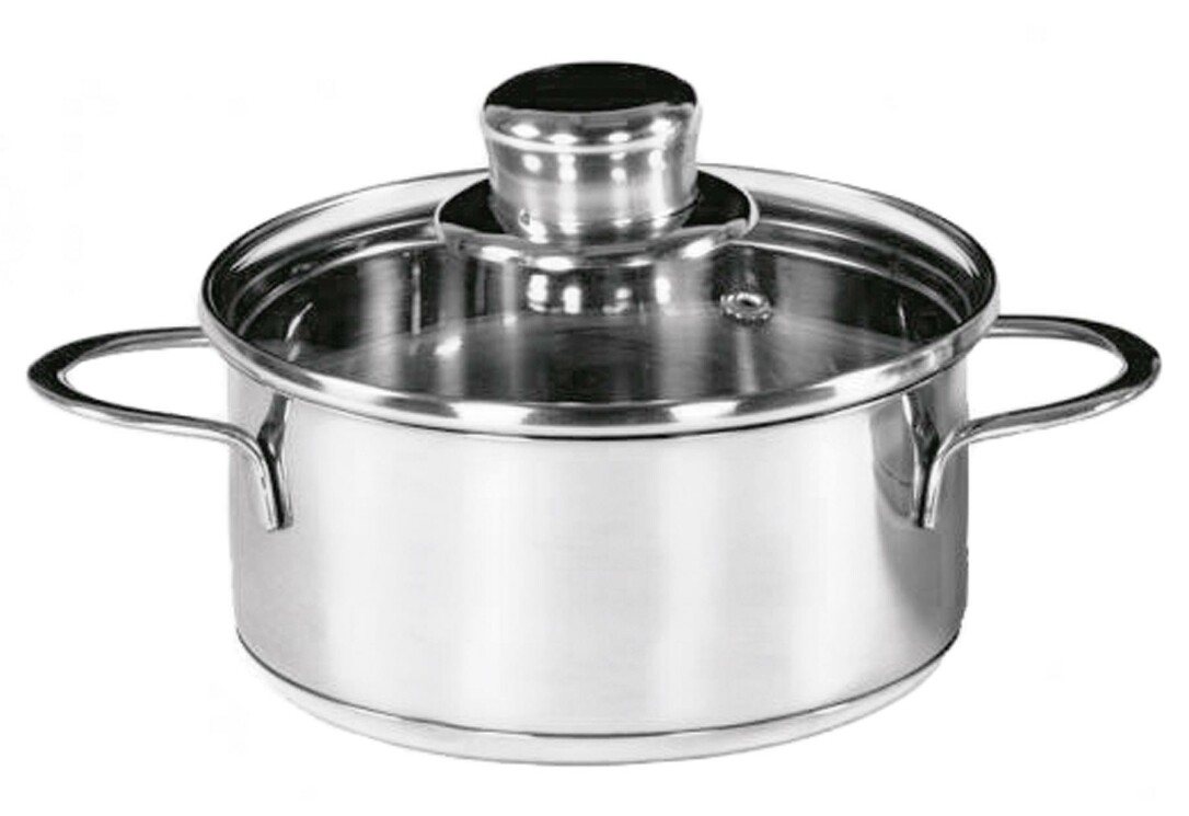 Topfkörper Edelstahl rostfrei, Durchmesser 14 cm, für ca. 0,75 Liter, außen hochglanzpoliert, innen matt, Glasdeckel mit Edelstahlrand und Abdampfventil, wärmeabweisende Kaltmetallgriffe, Kapselboden 3 mm, mit Glasdeckel, spülmaschinenfest
