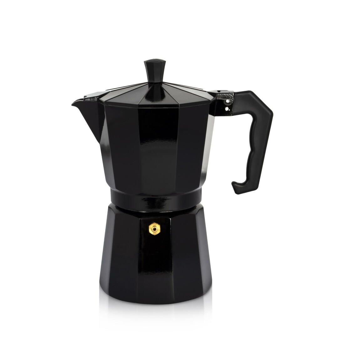 KRÜGER Espressokanne Italiano 6 Tassen. Farbausführung: schwarz. Griff und Deckelknopf aus Kunststoff bieten sicheren und bequemen Halt, das Sicherheitsventil verhindert ein Überlaufen. Schnelle und einfache Zubereitung für original italienischen Espressogenuss mit vollmundiger Crema, inkl. Trichtereinsatz, Sieb und Silikon-Dichtungsring. Geeignet für alle Herdarten, außer für Induktions-Kochfelder.