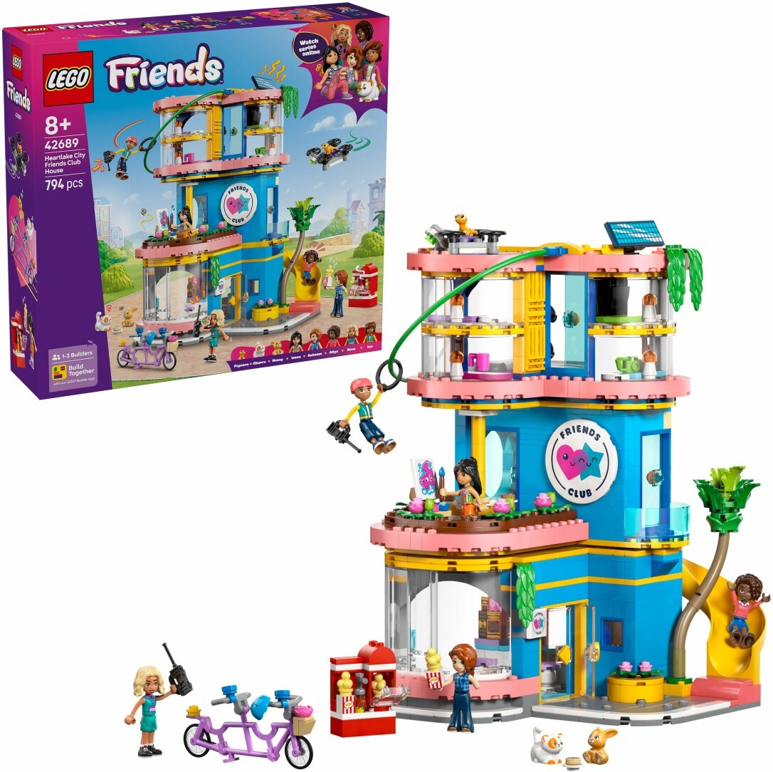 Lass der Fantasie freien Lauf mit dem LEGO Friends Friends Clubhaus (42689) entdecken Mädchen und Jungen ab 8 Jahren ein kreatives Puppenhaus voller Überraschungen. Dieses LEGO Puppenhaus ist der Treffpunkt für Mini Puppen und ihre tierischen Freunde. Kinder erleben spannende Missionen, gleiten an der Seilrutsche, klettern an der Wand oder rutschen ins nächste Abenteuer und lösen dabei sogar ein Geheimnis mithilfe eines versteckten Computers und einer Drohne! Das Spielzeug für Mädchen ab 8 Jahre enthält 5 Mini Puppen, eine Katze, einen Gecko und ein Häschen. Mit liebevollen Details wie einem Maltisch, einer Küche, einem Gaming-TV, einer Popcornmaschine, Donuts, Erdbeeren und Waffeln wird jedes Rollenspiel zu einem neuen Erlebnis. Auch Puppenzubehör Sets wie Futternäpfe und Kühlschrank sind enthalten. Dieses Miniatur Puppenhaus ist ein tolles Geschenk für Mädchen ab 8 Jahre, die LEGO für Mädchen, fantasievolle Abenteuer und kreative Aktivitäten lieben. Über die LEGO Builder App mit Gemeinsam bauen-Modus können Freunde und Familie gleichzeitig an verschiedenen Teilen des Sets bauen. Enthält 794 Teile. Das Modell ist 27 cm hoch, 18 cm breit und 19 cm tief Enthält 794 Teile CLUBHAUS SPIELZEUG FÜR MÄDCHEN UND JUNGEN AB 8 JAHREN: Kinder können Geschichten erzählen und tolle Aktivitäten mit dem LEGO Friends Heartlake City Clubhaus der Freunde Spielzeug erleben FÜR KREATIVES ROLLENSPIEL: Kinder können Alltagsgeschichten und Missionen im Clubhaus spielen, das eine Kletterwand, eine Rutsche, eine Seilrutsche, eine Küche und Bereiche für die Haustiere bietet 5 MINI PUPPEN UND 3 LEGO TIERFIGUREN: Enthält die kleinen Puppen Autumn, Nova, Aliya, Leo und Liann sowie die Haustiere Churro die Katze, Honey der Hase und Popcorn der Gecko PUPPENHAUS ZUBEHÖR: Futternäpfe, Gaming-TV und Controller, Kühlschrank, Popcornmaschine, Donuts, Erdbeeren, Waffeln, Geheimcomputer, Staffelei, Toilette, Drohne mit Startrampe und mehr GESCHENK FÜR MÄDCHEN UND JUNGEN: Dieses Bauset ist ein tolles Geburtstagsgeschenk für Mädchen und Jungen ab 8 Jahren, die fantasievolles Spielen mit Familie und Freunden lieben ZUSAMMEN BAUEN MODUS: Die LEGO Builder App bietet ein gemeinsames Bauerlebnis mit Freunden und Familie, bei dem alle Spaß haben und jeweils einen Teil des Sets mit ihrem eigenen Gerät bauen können ONLINE-SERIE: Weitere kreative Spielideen für andere separat erhältliche Sets findest du in der Online-Serie LEGO Friends: Das nächste Kapitel, in der Kinder die Freunde in Heartlake City kennenlernen
