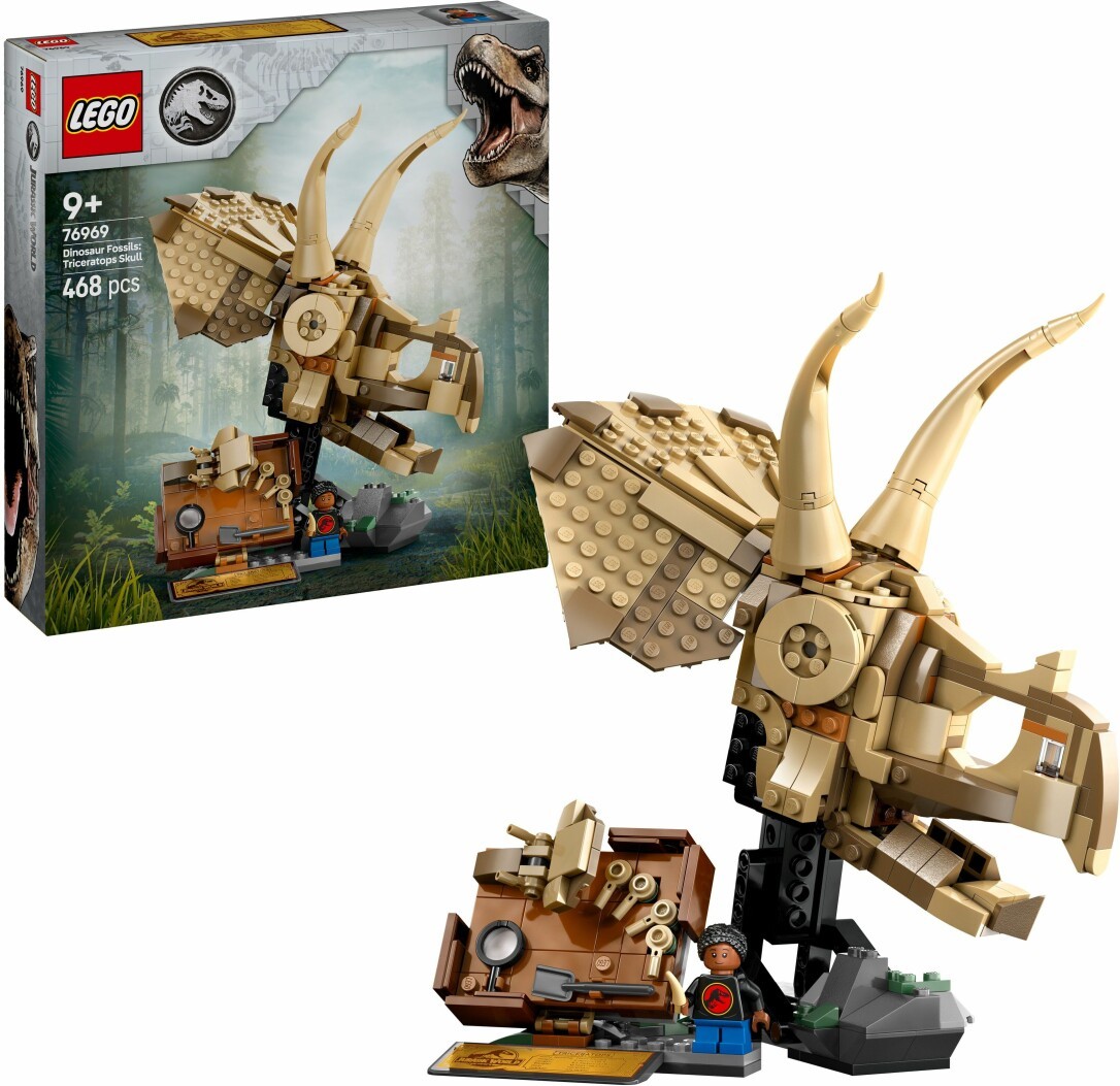 Dinosaurier-Fossilien: Triceratops-Schädel (76969) ist ein LEGO Jurassic World Bauset, das jungen Paläontologen ein fantasievolles Jurassic World Spielerlebnis bietet und das Kinder Fossilien sammeln lässt. Dieses Spielset aus der Reihe der Dinosaurier-Fossilien beinhaltet neben dem Triceratops-Schädel mit aufklappbarem Kiefer auch einen Ständer auf einem Felssockel, eine Ausgrabungsstätte mit Mini-Fossilien und Ausgrabungswerkzeugen, eine LEGO Minifigur, eine Infotafel und ein Stück ''Bernstein, in das eine Mücke eingebettet ist. Die LEGO Builder App begleitet junge Dinosaurierfans auf ein intuitives Bauabenteuer. Digitale Funktionen lassen Kinder 3D-Modellansichten vergrößern und drehen, Sets speichern und den Baufortschritt verfolgen. Und vielleicht werden sie beim Bauen von derselben Faszination gepackt, die auch echte Paläontologen bei einem neuen Fund verspüren! Unter den separat erhältlichen LEGO Jurassic World Sets findest du noch weitere Spielzeug-Dinos, die Kinder fantasievoll spielen und klassische Filmszenen nachstellen lassen. Man kann die Modelle bauen und dann ausstellen, um allen seine Begeisterung für Urzeitechsen zu zeigen. Die Sets sind tolle Geschenke für Kinder und Dino-Fans jeden Alters. Auf dem Ständer ist der Triceratops-Schädel 22 cm hoch, 17 cm breit und 17 cm tief. Enthält 468 Teile.