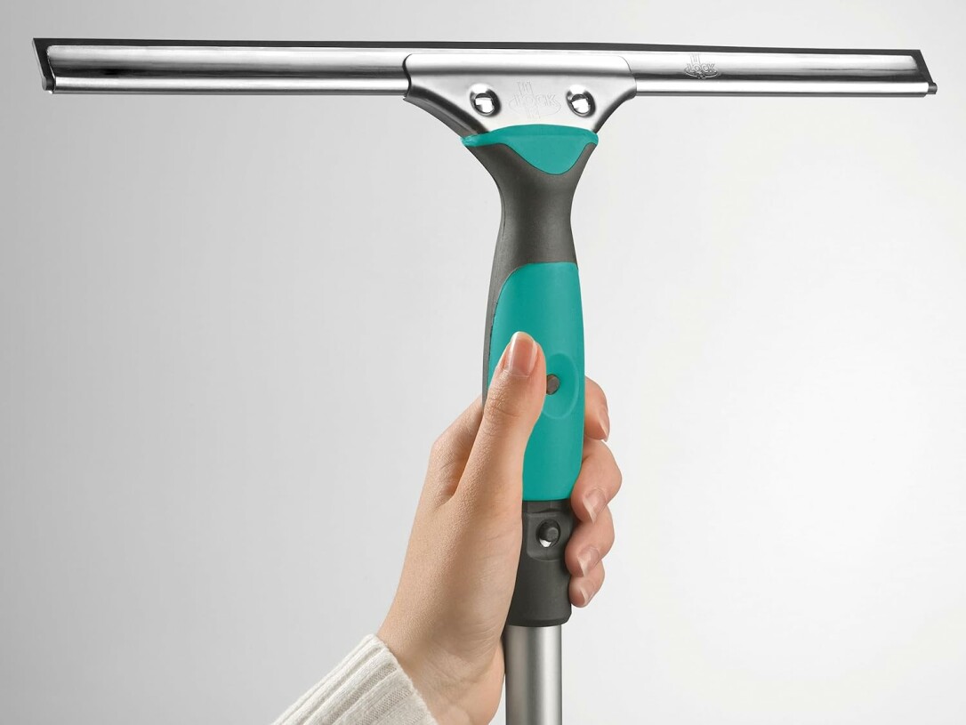 Der Profi-Fensterabwischer mit verstellbarer Edelstahl-Trägerschiene. So lassen sich auch schwer zugängliche Stellen und Objekte wie vergitterte Fenster optimal reinigen. Die hochflexible Gummilippe garantiert dabei ein streifenfreies Abziehen.
