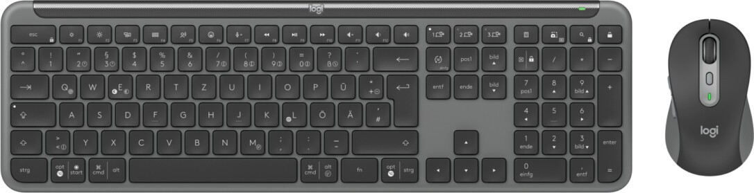 Logitech MK950 Signature for Business. Tastatur Formfaktor: Volle Größe (100%). Tastatur-Stil: Gerade. Übertragungstechnik: Kabellos, Geräteschnittstelle: RF Wireless + Bluetooth, Tastatur-Switch: Scherenschalter, Tastaturaufbau: QWERTZ, Empfohlene Nutzung: Büro. Produktfarbe: Graphit. Maus enthalten