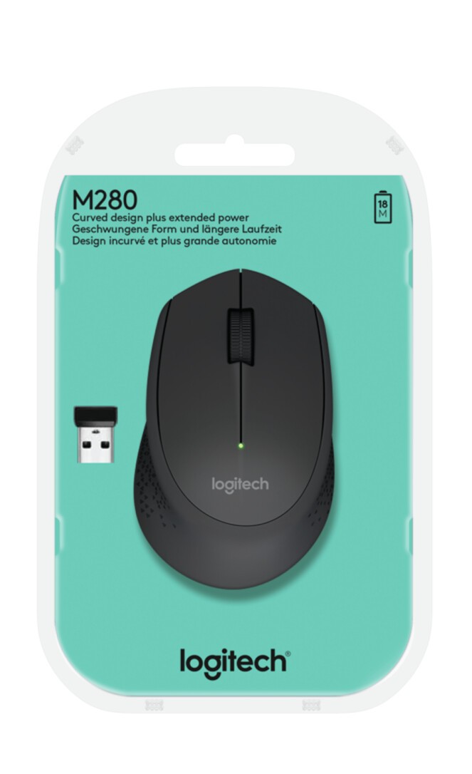Logitech® Wireless Mouse M280 is the perfect synthesis of functionality, aesthetics and comfort: A unique asymmetric shape that fits well, a wide wheel that improves scrolling experience and a soft rubber surface with distinctive patterns that improves touch feeling. Everything from curves to colors was designed to delight your hand and eyes.