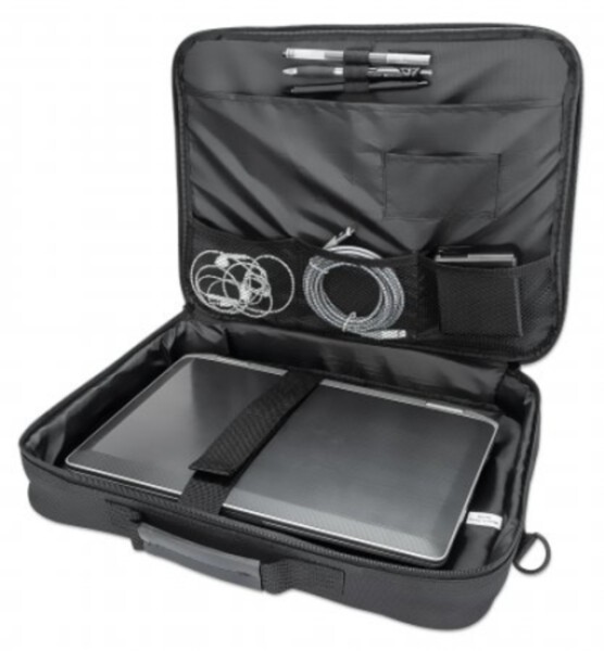 Many notebook bags are top loading, which means they form a sort of bucket inside the main compartment. If you have an inner pocket with several accessories, you are forced to pack them vertically on top of each other. The full clamshell opening of the Manhattan Cambridge Notebook Bag 15.6" makes access to the inner compartment much more convenient. This construction lets you find the right item easier, and it’s also makes it a big help with handling your laptop at airport security inspections. Beyond that, the Cambridge Notebook Bag features many stowing options that you’ll be glad to have on your trip. Never know where to safely put your or your customers’ business cards? A separately little pocket keeps them safe and crease-free. Large front, rear and interior pockets offer plenty of space for cables, files, headphones and more. The notebook compartment itself is amply padded to protect your valuable device from bumps and scratches. Thanks to its compact design, this Notebook Bag can be easily stowed in seat pockets or overhead bins. A sturdy handle and a removable, non-slip shoulder strap ensure safe and comfortable transportation.