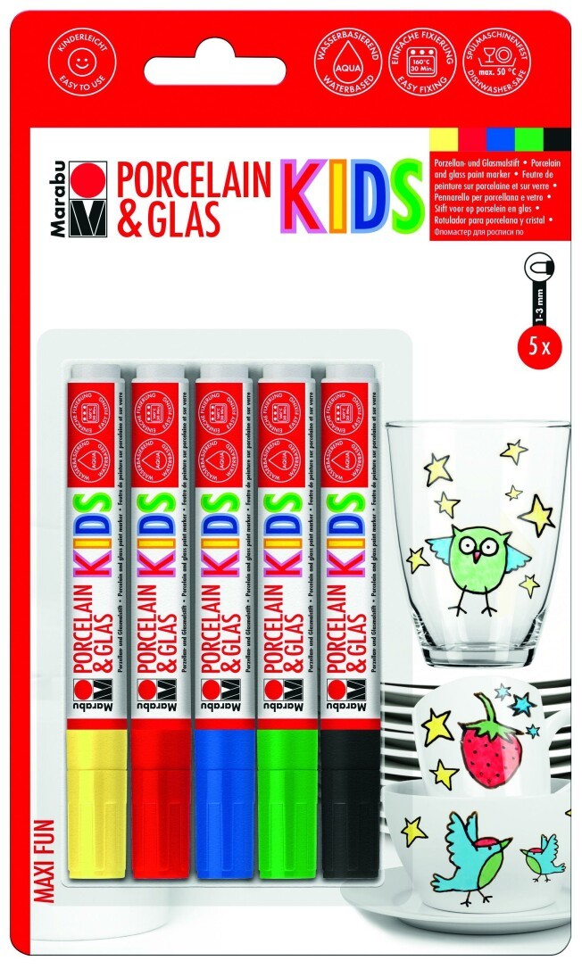Der ultimative Bastelstift für kinderleichte Porzellan- und Glasmalerei! Auf Wasserbasis und bestens für Kinder ab 3 Jahren geeignet. Ideal für kleine Hände: Universalspitze und dickes Stiftmodell. Spülmaschinenfest nach dem Einbrennen (160°C, 30 Min.)Marabu KiDS Porcelain & Glas Painter, "Maxi Fun", 5 x Porcelain & Glas Painter 1-3 mm (Gelb, Kirschrot, Dunkelblau, Dunkelgrün, Schwarz)