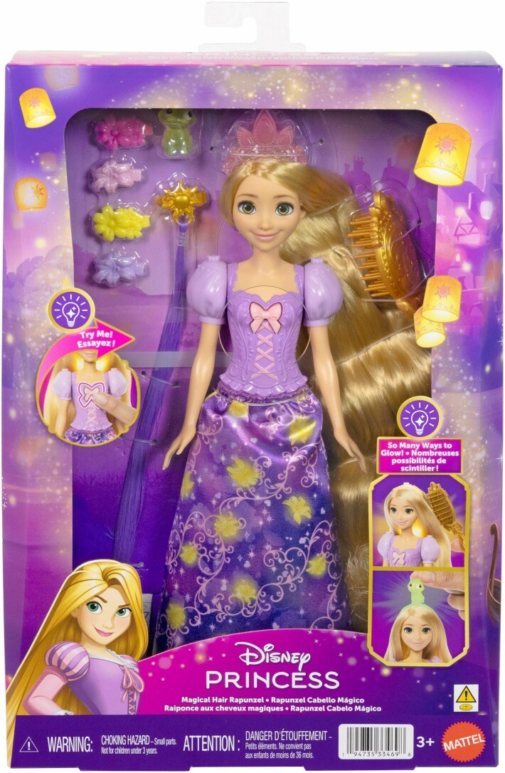 Mit dieser interaktiven Modepuppe können Kinder Rapunzels magisches, leuchtendes Haar aus dem Disney-Film nachstellen! Die Rapunzel-Puppe kann auf vier Arten leuchten: beim Bürsten ihrer Haare, beim Anschließen ihrer Tiara, beim Anbringen ihres Freundes Pascal oder beim Drücken ihres Stirnbandes. Das Set enthält eine lila Haarverlängerung, eine Bürste und mehrere Haarspangen, um den Spielspaß mit den Haaren zu verlängern. Ab 3 Jahren.
