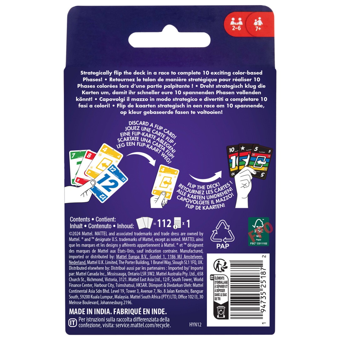 Phase 10 Flip, entwickelt von den Machern des Kartenspiels UNO, stellt den Kartenspielklassiker Phase 10 buchstäblich auf den Kopf! Die Spieler müssen auch hier so schnell wie möglich 10 Phasen abschließen, jedoch warten einige unerwartete Wendungen auf sie die Karten sind zum Beispiel beidseitig bedruckt und es gibt spezielle FLIP-Karten. Auf der einen Seite der Karten sind die gewohnten Farben, die andere Seite der Karten gestaltet sich jedoch KOMPLETT VERRÜCKT! Da es in diesem Spiel darum geht, Folgen in einer Farbe abzuschließen, müssen die Spieler strategisch vorgehen: entweder sie drehen ihre Karten auf die verrückte Seite, um ihre Phasen schneller abzuschließen, oder sie drehen sie auf die Farbseite zurück, um ihre Gegner aufzuhalten. Dieses lustige Kartenspiel für die ganze Familie ist genau das Richtige für Kinder ab 7 Jahren. Abweichungen in Farbe und Gestaltung vorbehalten.