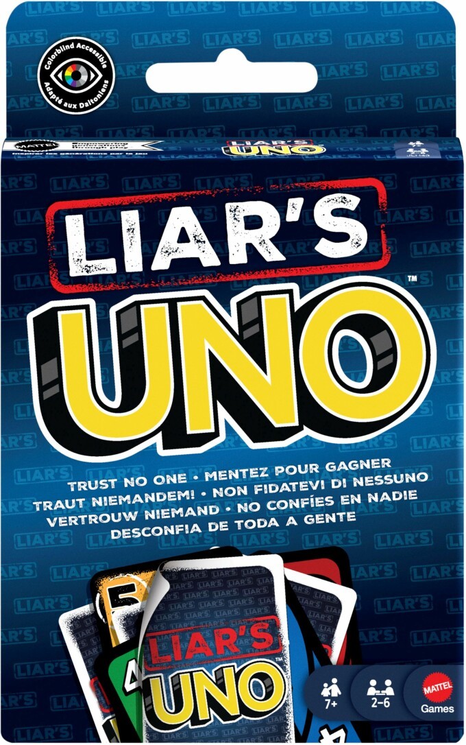 Bei Liars UNO sind Lügen keine Schummelei, sondern Teil des Spiels! Eine Lügnerkarte wird mit der Vorderseite nach unten abgelegt und es wird angesagt, um welche Karte es sich handelt. Ertappte Lügner müssen eine Karte ziehen wird jedoch jemand ohne Grund verdächtigt, muss die andere Person die Karte ziehen! Die Spieler versuchen, durch Bluffs zu gewinnen. Aber wer nur noch eine Karte hat, muss immer noch ''UNO'' sagen! Besondere Grafiksymbole, die jeder Karte zugeordnet sind, helfen bei der Identifizierung der Farbe(n) der Karte, sodass Spieler mit jeglicher Art von Farbenblindheit ebenfalls spielen können. Liars UNO ist für Spieler ab 7 Jahren geeignet und ist ein großartiges Geschenk für die Fans gemeiner Kartenspiele!