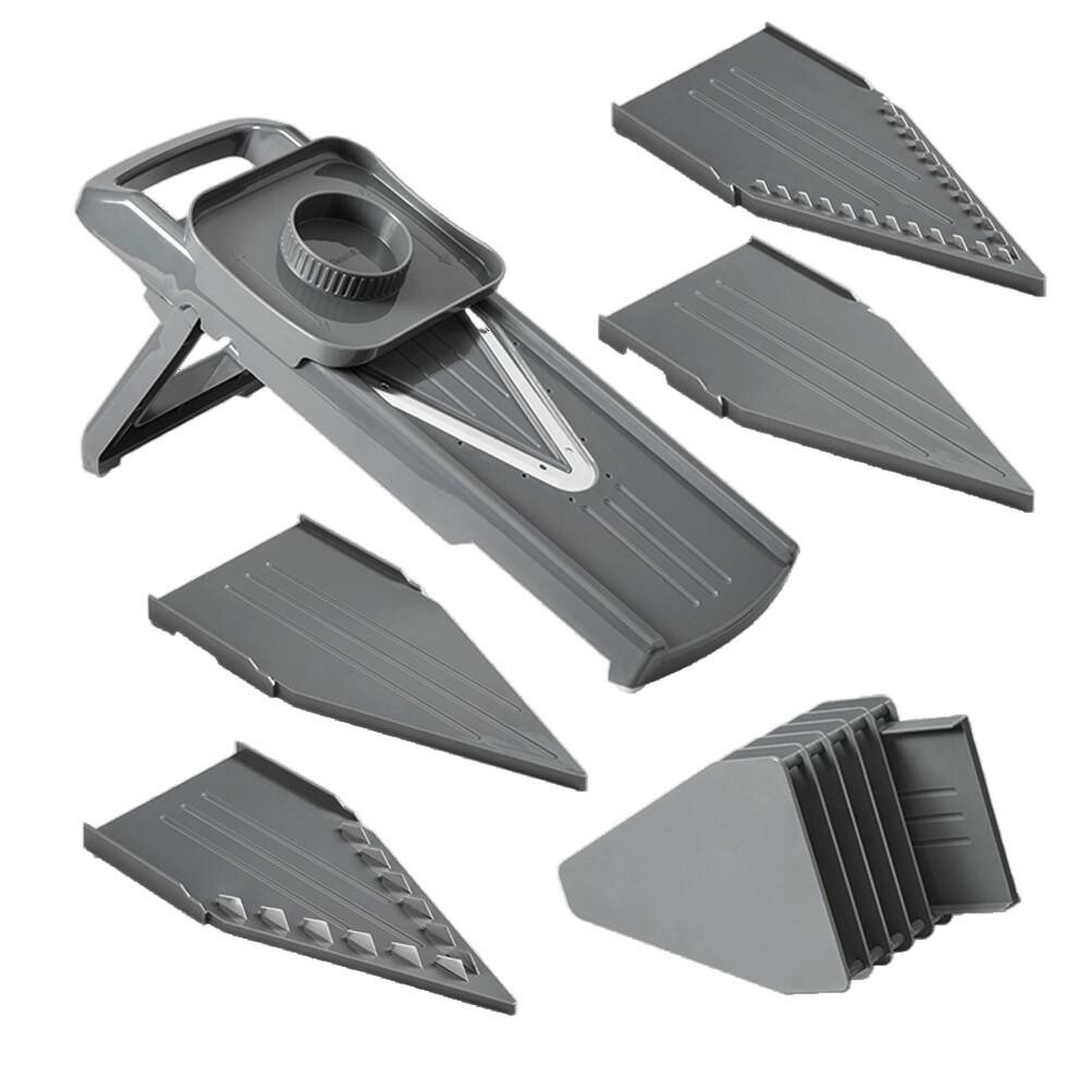 Edelstahl / Kunststoff ABS, mit Aufbewahrungsfach für Klingen und Fingerschutz, inkl. 5 auswechselbaren Einsätzen, für Scheiben, S (1,5 mm), M (2,5 mm), L (3,5 mm), für Streifen fein (3,5 mm) und grob (7 mm), klappbarer Fuß