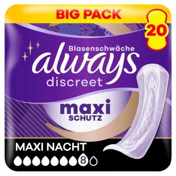 Das Always Discreet Maxi Inkontinenz-Einlagen Sortiment ist ideal für sorgenfreie Nächte. Always Discreet Inkontinenz-Einlagen Maxi Nacht sind besonders sicher. Sie wurden entwickelt, um Ihnen zusätzlichen Schutz und mehr Saugfähigkeit* zu bieten, damit Sie sich keine Sorgen über Auslaufen machen müssen. Ihre Struktur ermöglicht starken Schutz mit einem ultradünnen Kern, sodass Sie nicht zwischen Komfort und Schutz wählen müssen. Wenn Niesen oder Lachen Blasenschwäche verursacht, bieten die Always Discreet Einlagen Maxi Nacht optimalen Schutz.*im Vergleich zu Always Discreet Maxi.