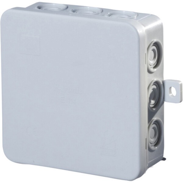 100 x 100 x 40 mm, Farbe Grau, Hohe Montagefreundlichkeit, mit bis zu 12 selbstdichtenden Abschneid-Leitungseinführungen für Leitungen bis 5 x 2,5 mm², Deckel aus Polypropylen, Unterteil aus Polyethylen gewährleisten nachträgliches Ausrichten, UV-beständig, Material: PE, recycelbar