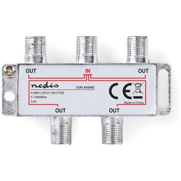 4-Wege-Splitter im Zinkdruckgussgehäuse mit F-Steckern zur Aufteilung eines TV-Signals.