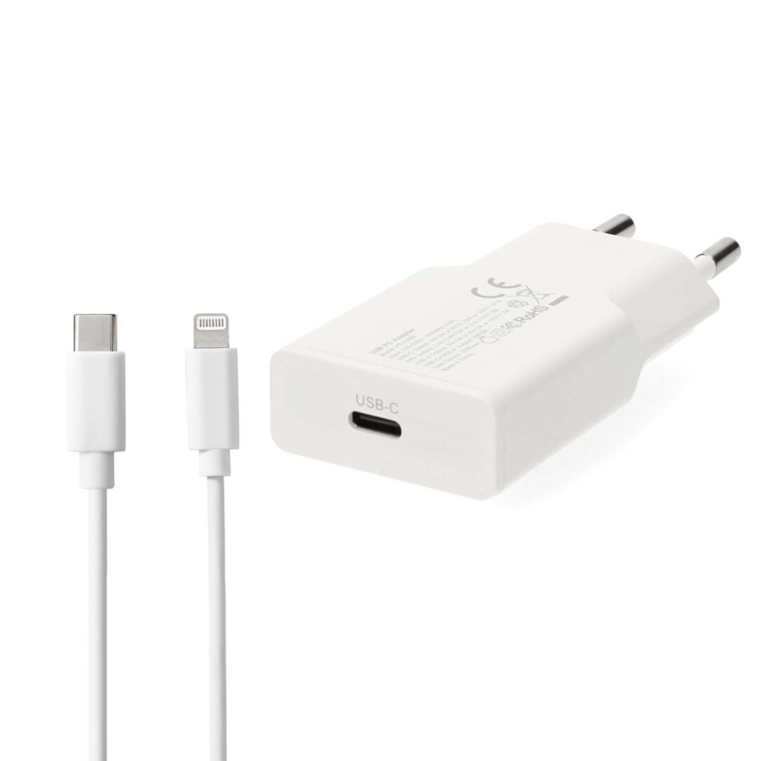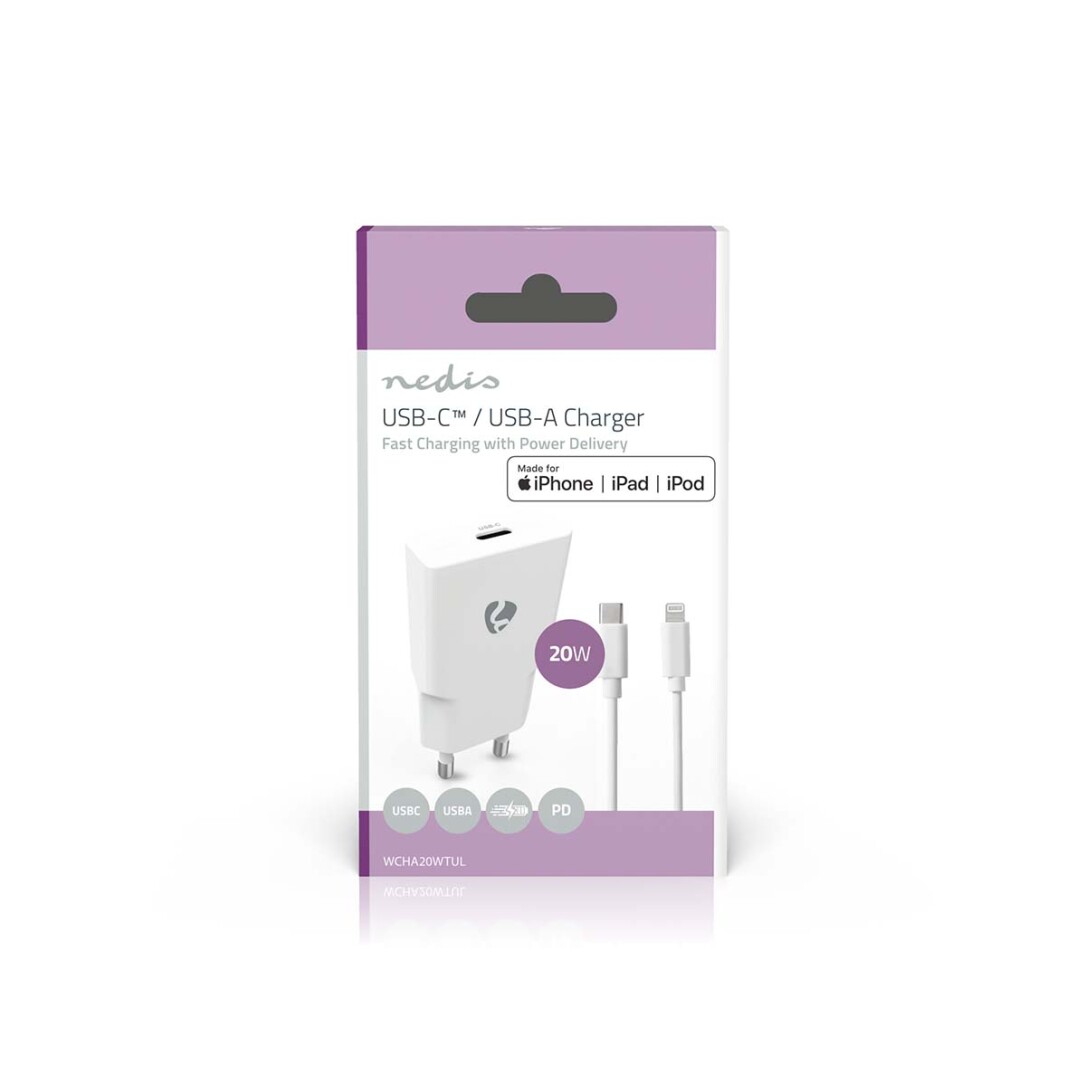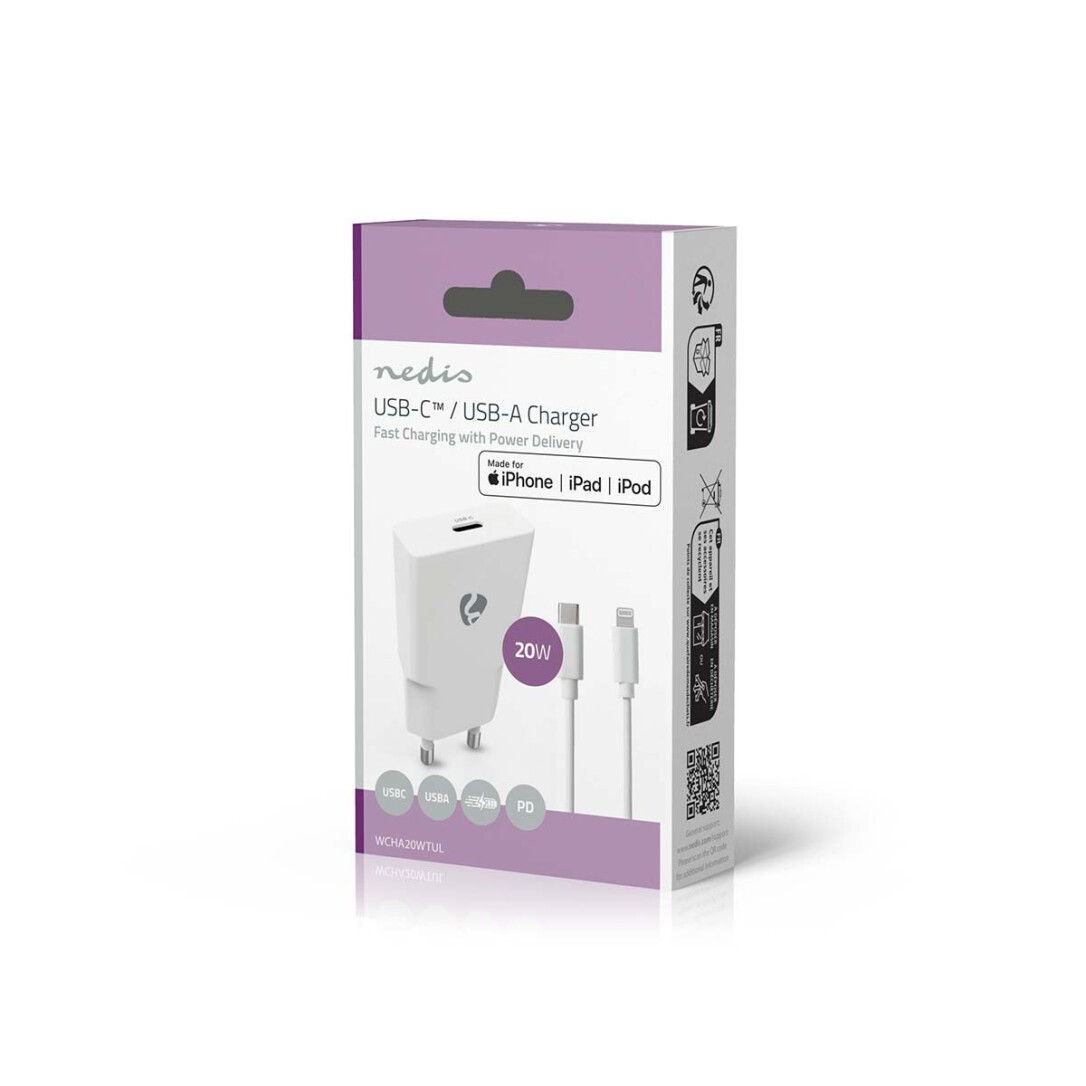 Nedis Netzladegerät / 20 W / GaN / PD3.0 / Schnellladefunktion / 1.67 A / 2.22 A / 3.0 A / Anzahl der Ausgänge: 1 / USB-C™ / Lightning 8-Pin (Lose) Kabel / 1.00 m / Automatische Spannungswahl / Weiss