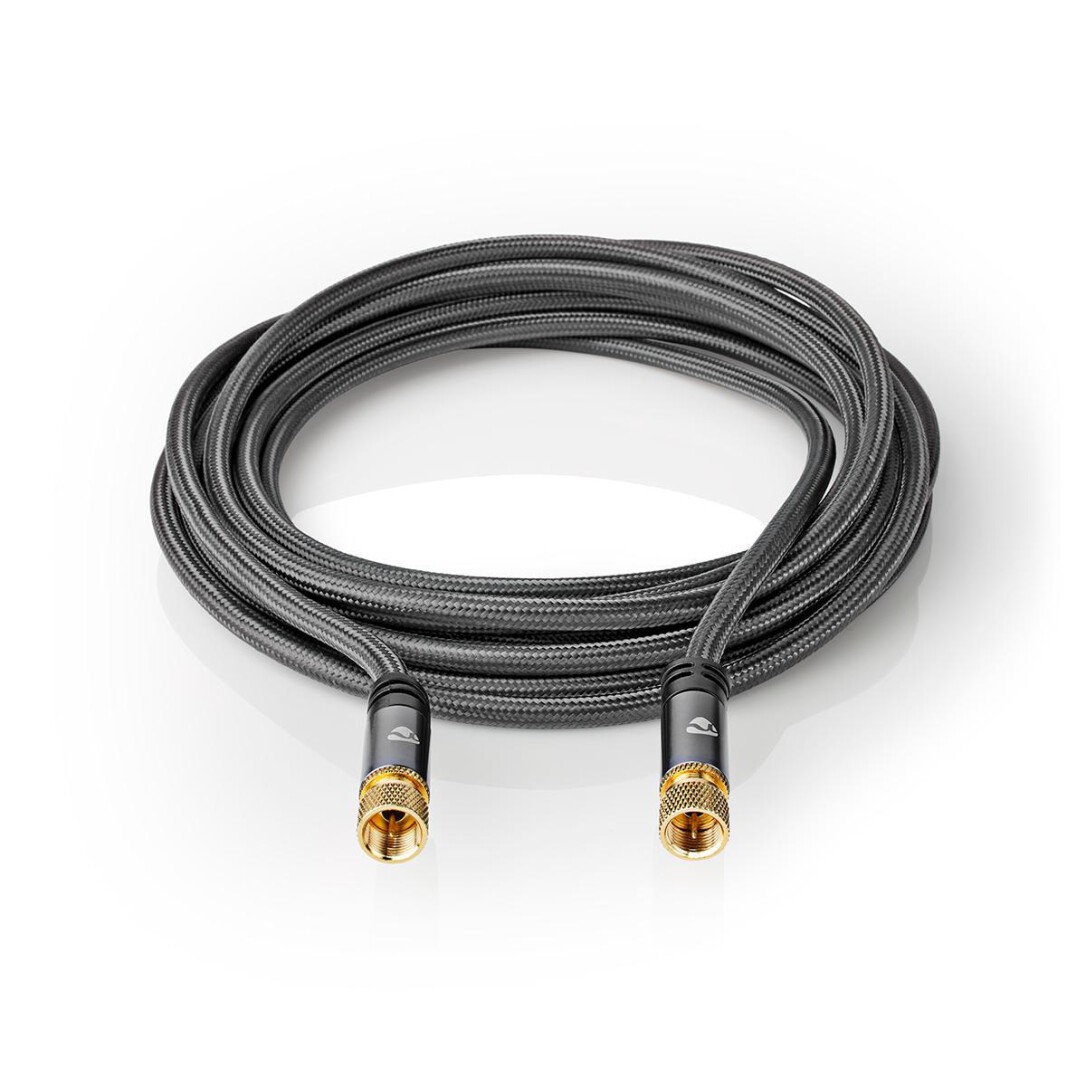 Nedis Satelliten- und Antennenkabel / F Stecker / F Stecker / Vergoldet / 90 dB / 75 Ohm / 4-fach geschirmt / 5.00 m / Rund / Baumwolle / Grau / Gun Metal Grau / Verpackung mit Sichtfenster